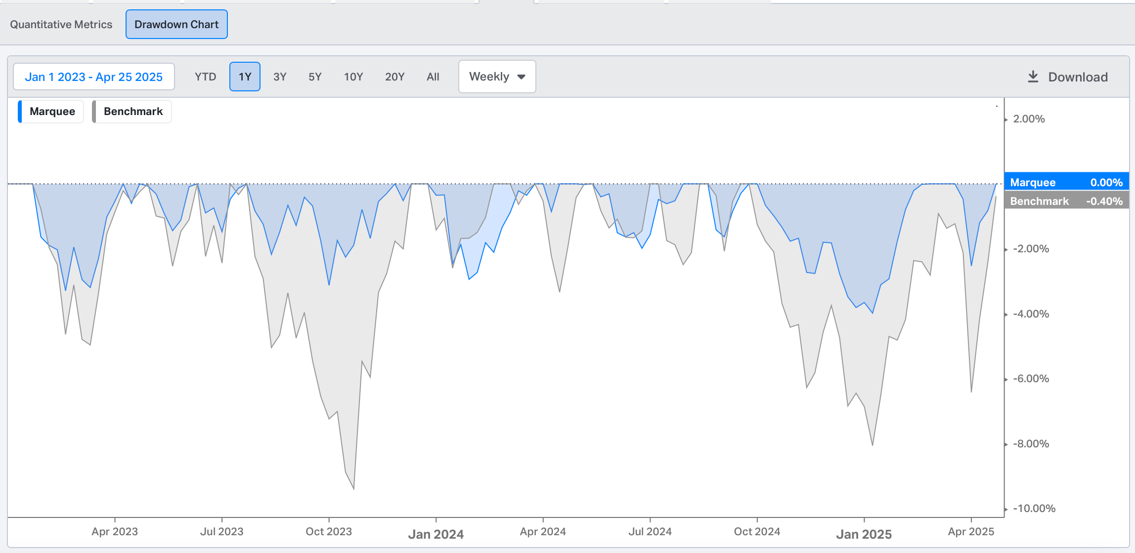 When we zoom out and look, the severity of drawdowns in our portfolio has been significantly below the benchmark on almost every occasion.