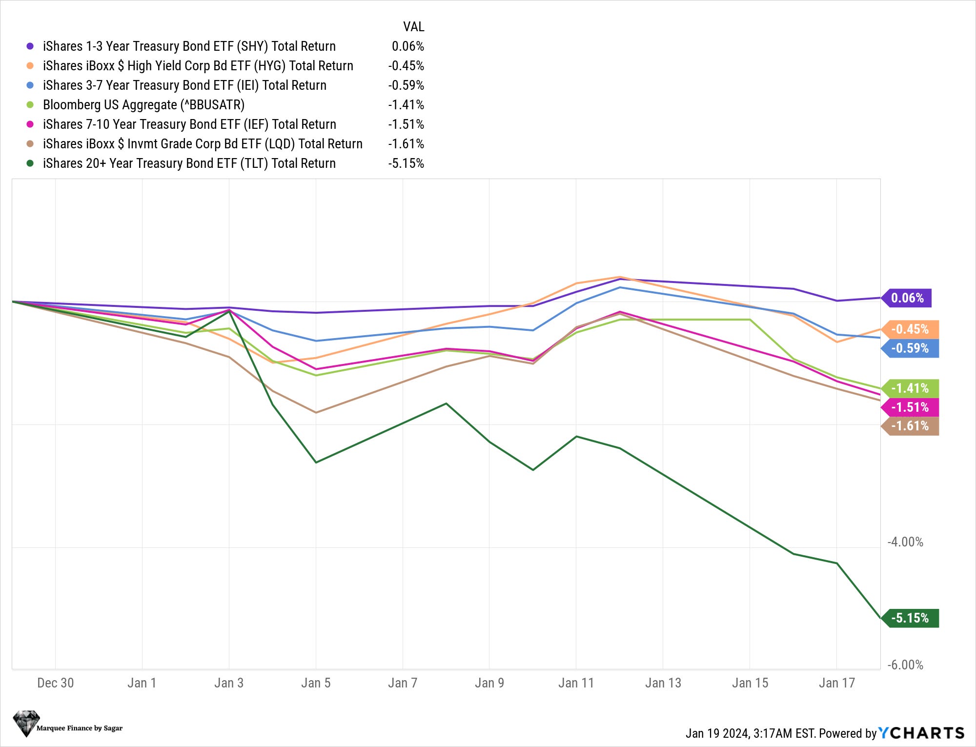 As a result, the most “consensus” trade (long-duration bonds) of 2024 has seen an unwind in the last two weeks.