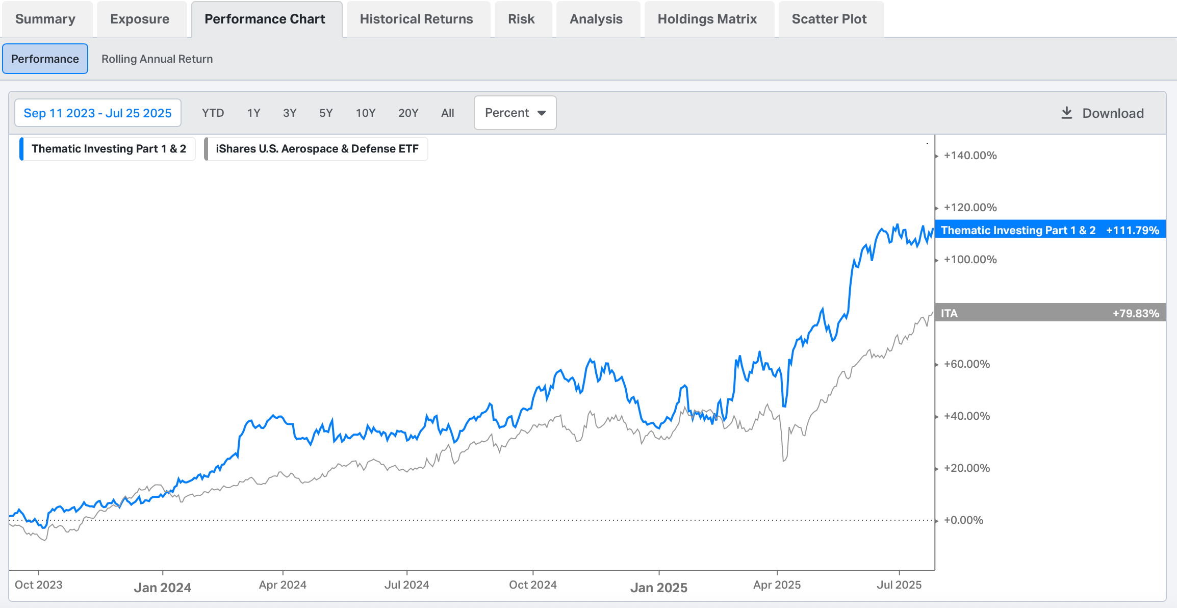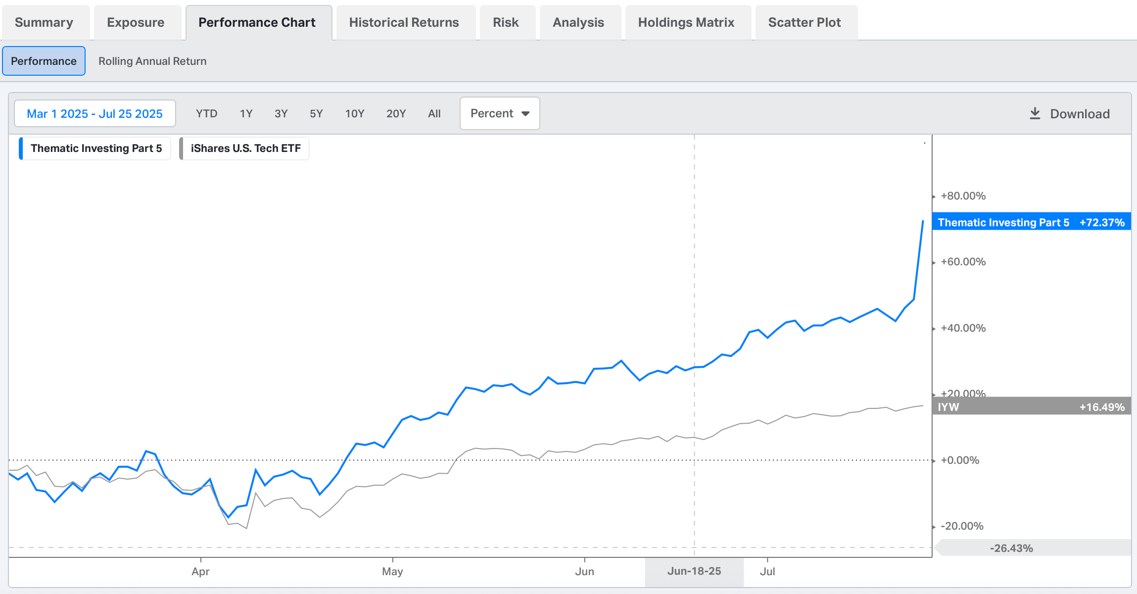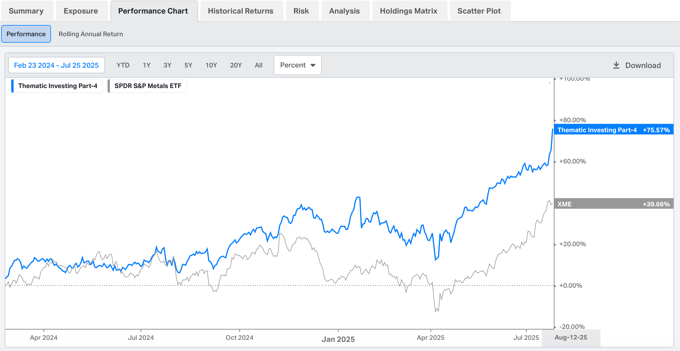 The Thematic Investing Part 4 is up 76% against the benchmark's 40% performance since February 23, 2024.