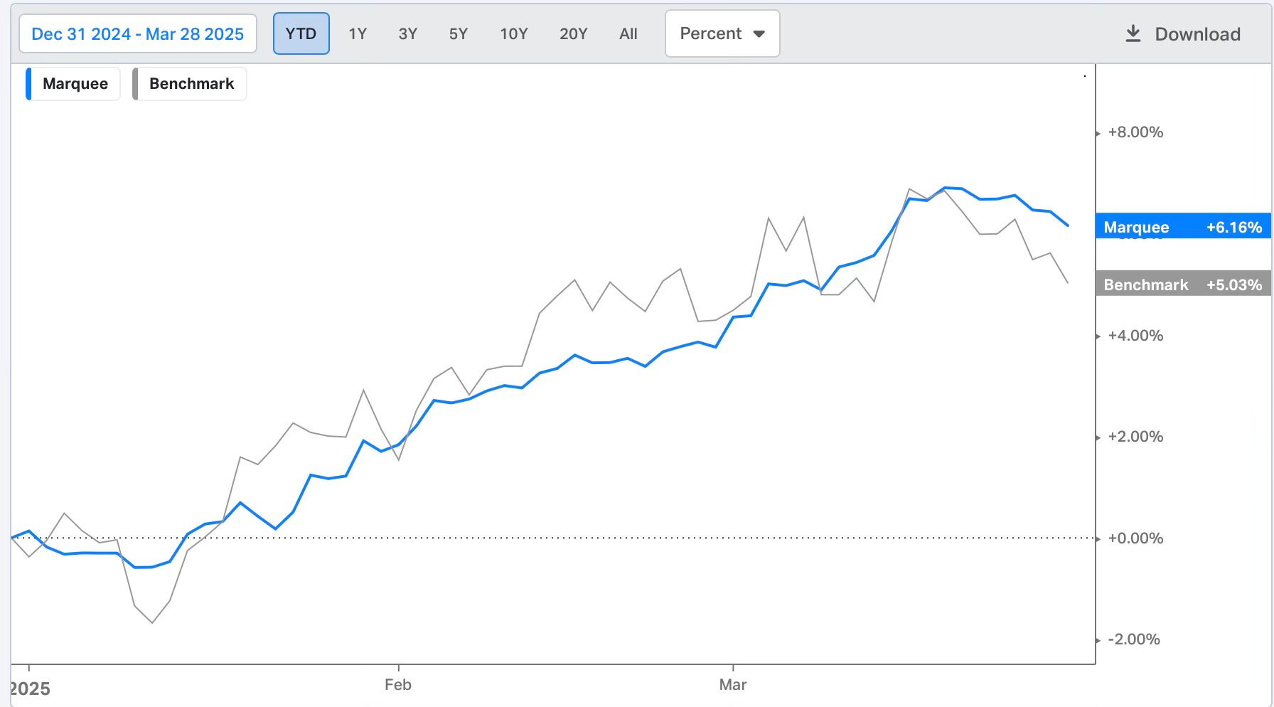 Amid all the chaos, we have significantly outperformed our benchmark thanks to our high cash allocation and short position on the S&P 500 (underweight equity stance).