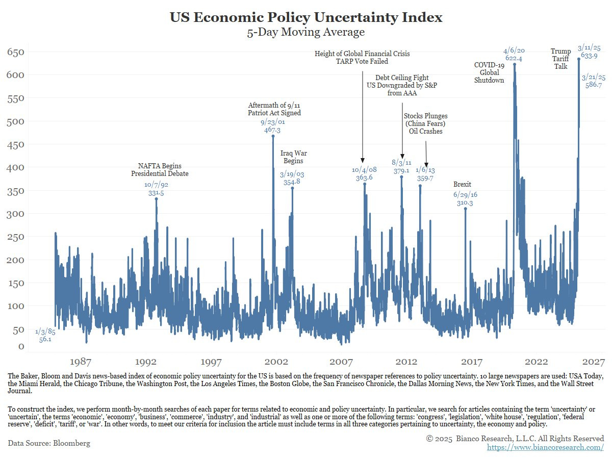 We have now crossed the COVID highs in the US Economic Policy Uncertainty Index as Liberation Day (2nd April) nears and wild negotiations are underway.