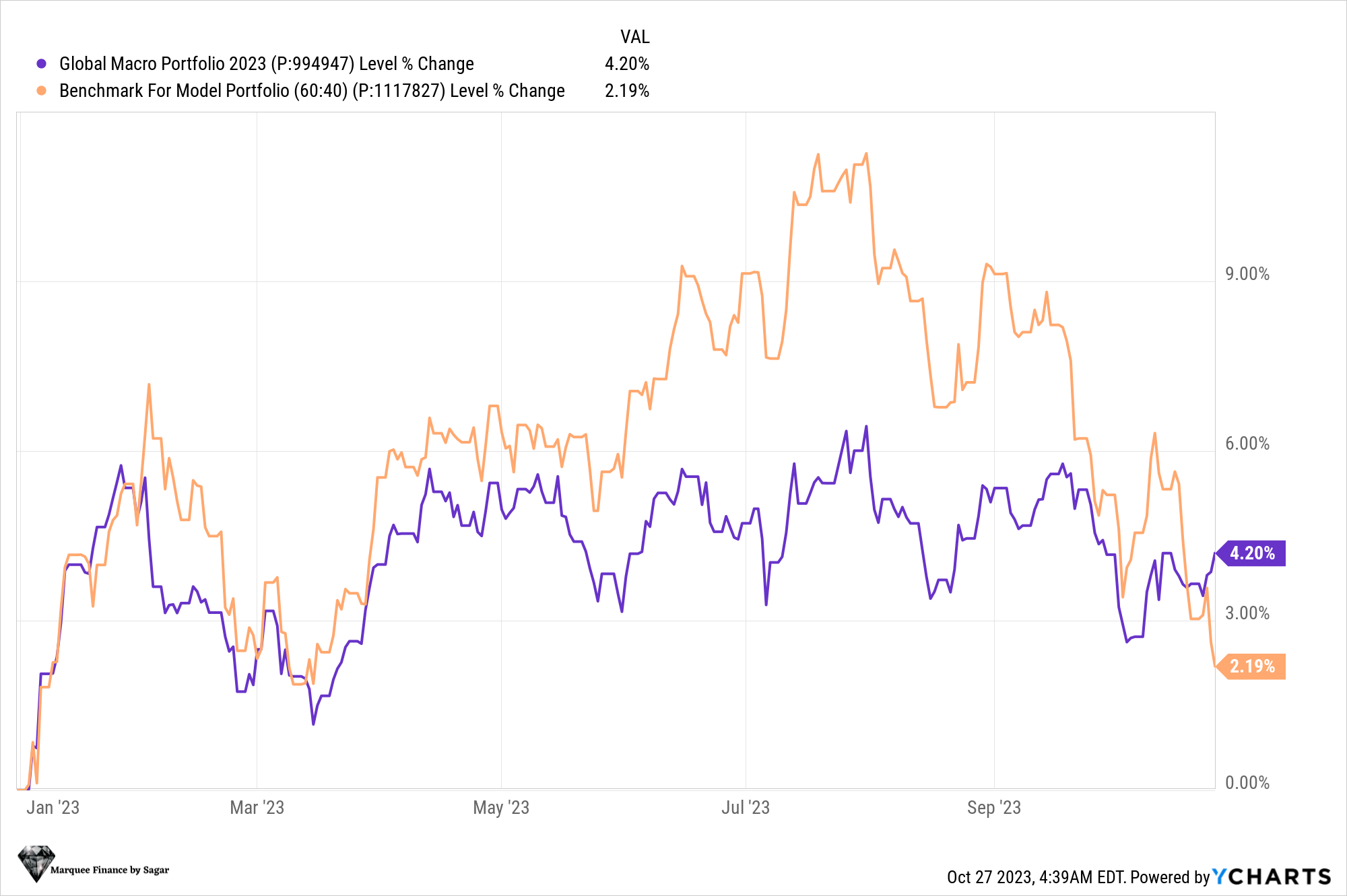 As of yesterday, our Global Macro Portfolio is up more than 200 bps from the traditional 60: 40 portfolio (60% in MSCI World and 40% in US Bloomberg Aggregate).