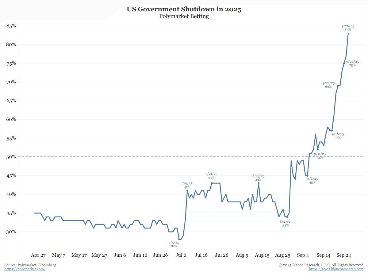 According to Polymarket, there is an 83% probability that a US Government shutdown will occur within the next 72 hours.