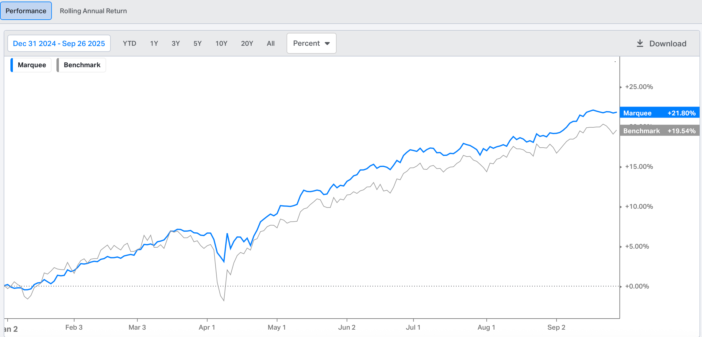 We are glad to inform you that we are up by 21.8% YTD compared to a return of 19.54% for the benchmark (more than 240 bps of outperformance).