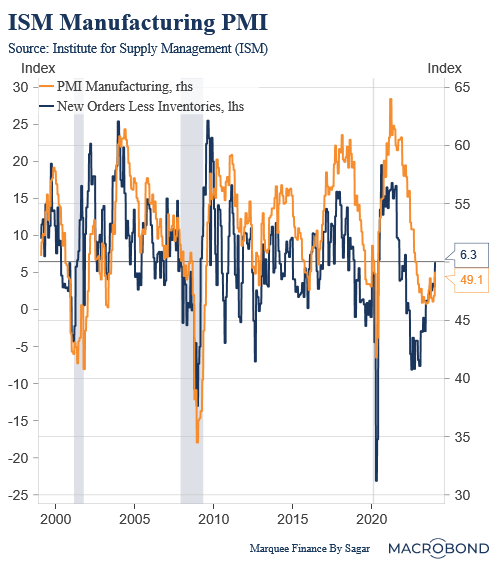 My favourite measure, New Orders Less Inventories, has jumped significantly higher as new orders moved back above 50.
