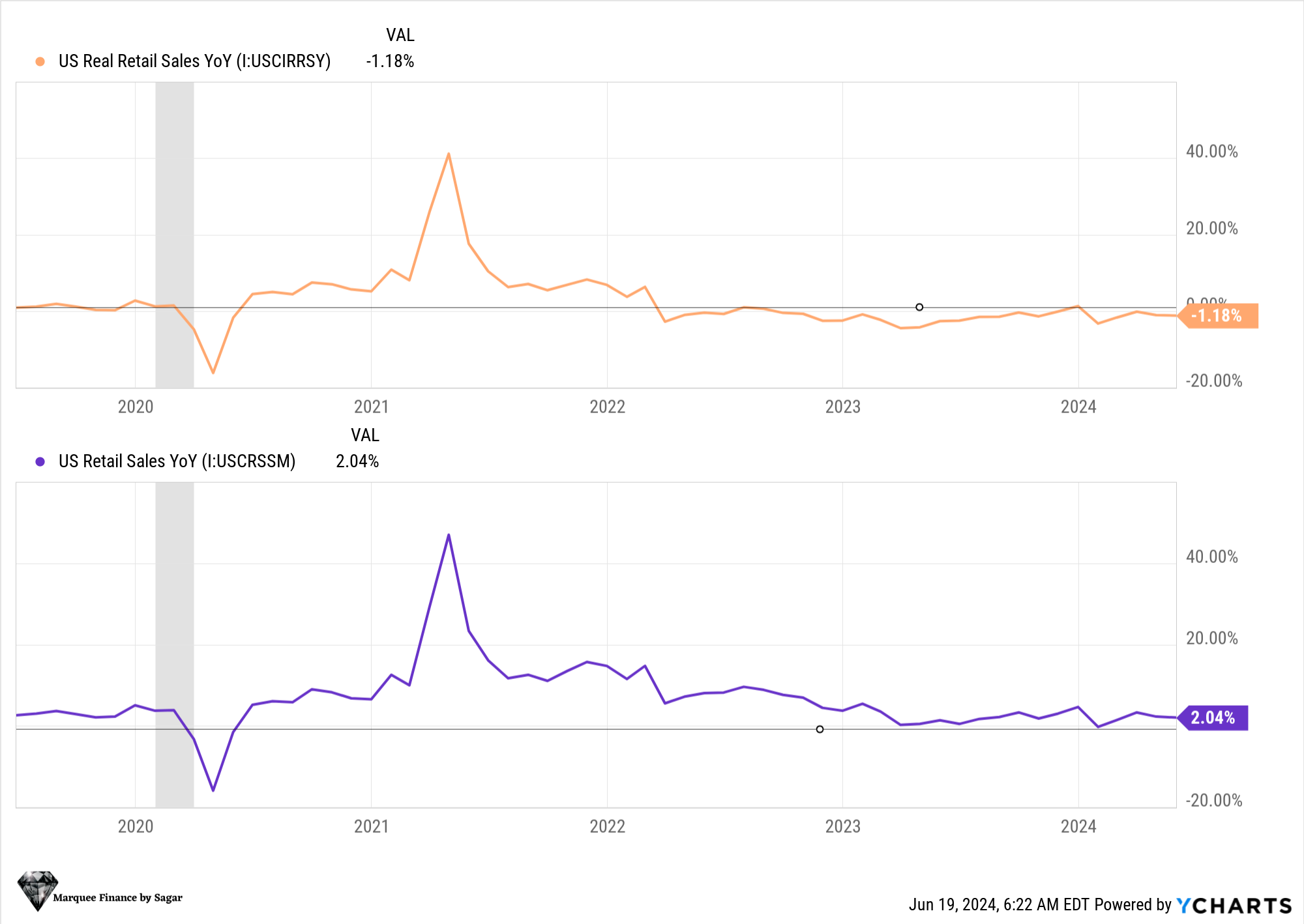While nominal retail sales have been subdued, real retail sales (adjusted for inflation) remain in negative territory, indicating that the bottom pyramid of consumers is struggling.