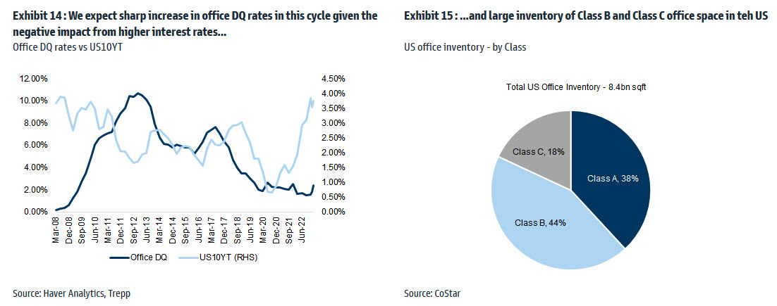 The total CRE market is $11 trillion, of which $4.5 trillion is the total outstanding debt. However, as we all know, the stress is visible only in the office space while the rest of the CRE market is resilient. Nevertheless, the situation might change if a hard landing ensues.