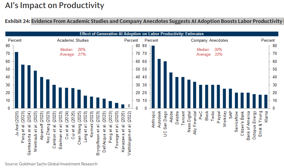 Various studies portray that AI will lead to productivity gains. According to Goldman Sachs, academic studies and company anecdotes suggest that AI Adoption Boosts labour productivity by around 27-33% on average.