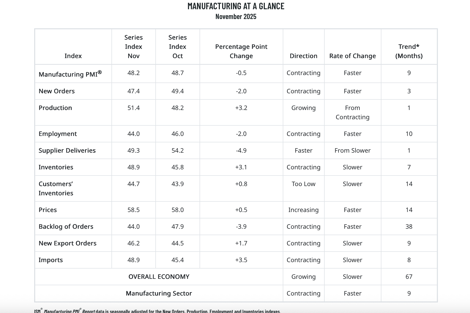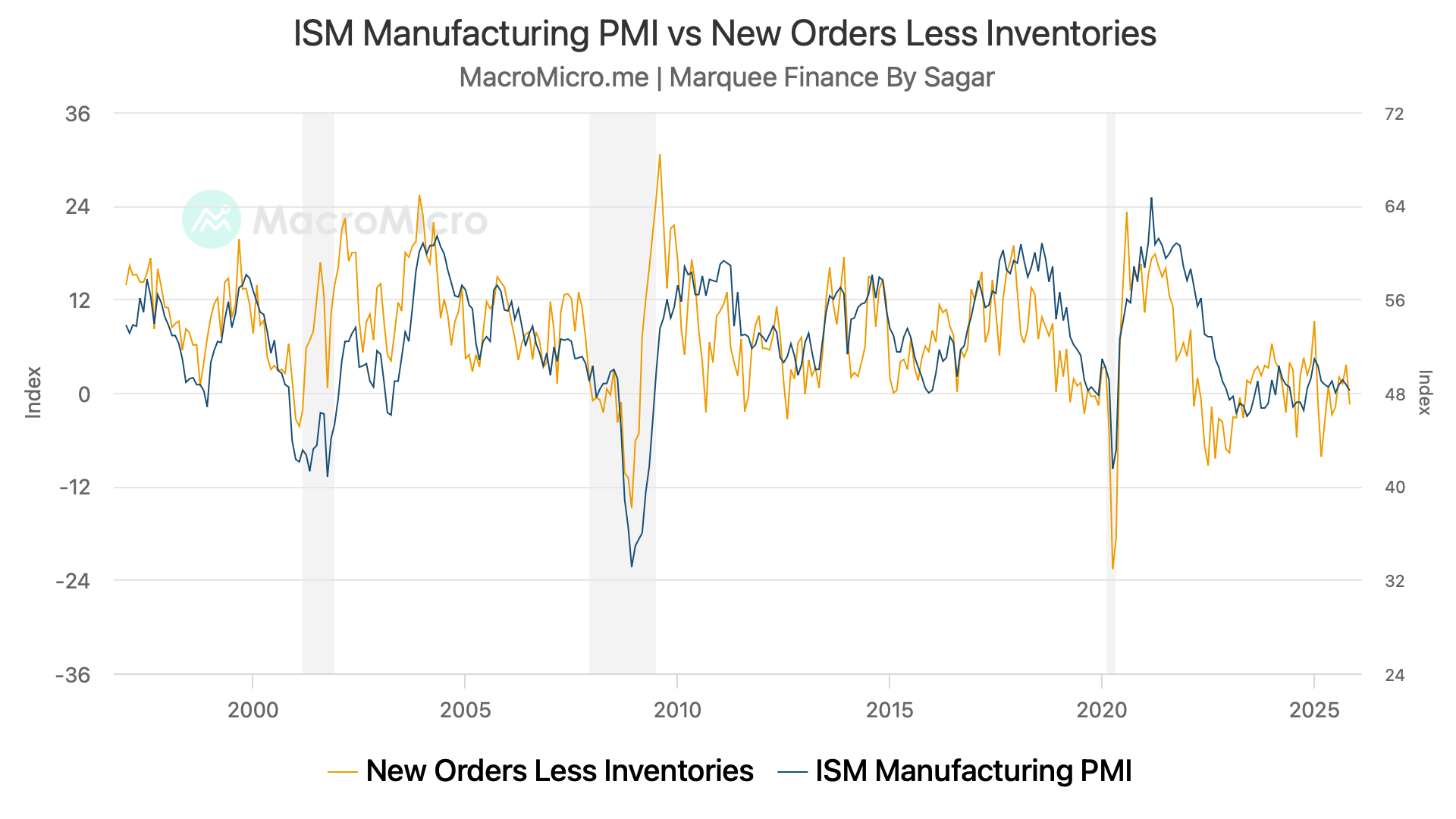 New Orders Less Inventories fell sharply, reversing the trend and indicating that the ISM Manufacturing PMI might follow suit.