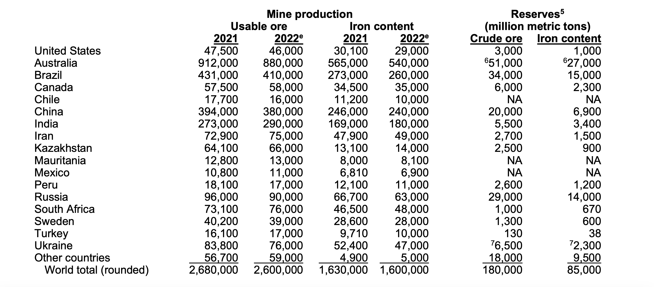 We can observe that Australia, Brazil, China and India tightly control iron ore production.