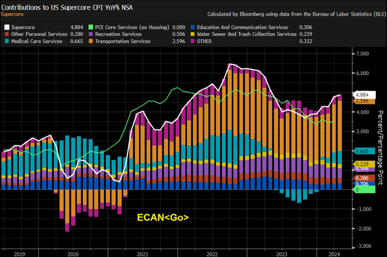 The Supercore has moved higher to 4.88% YoY, led primarily by transportation services, which include auto insurance, and the prime rate-led inflation, which will only ease by H2 this year.