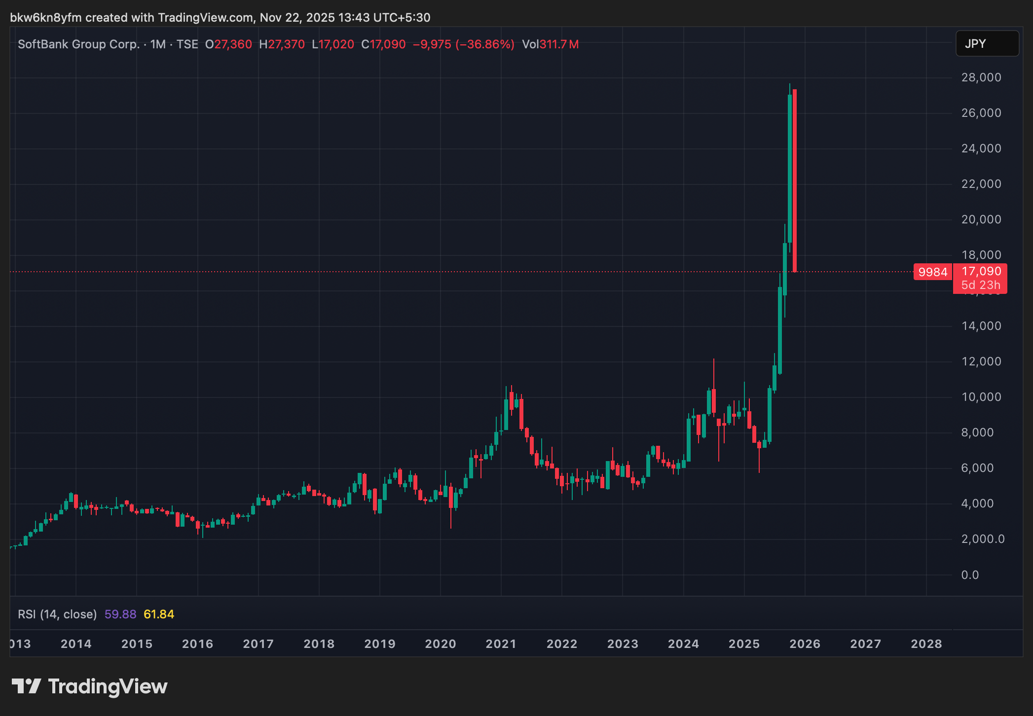 Softbank Group stock, which rose 45% last month, is now down 38% from its highs and has given up all its gains since mid-September.