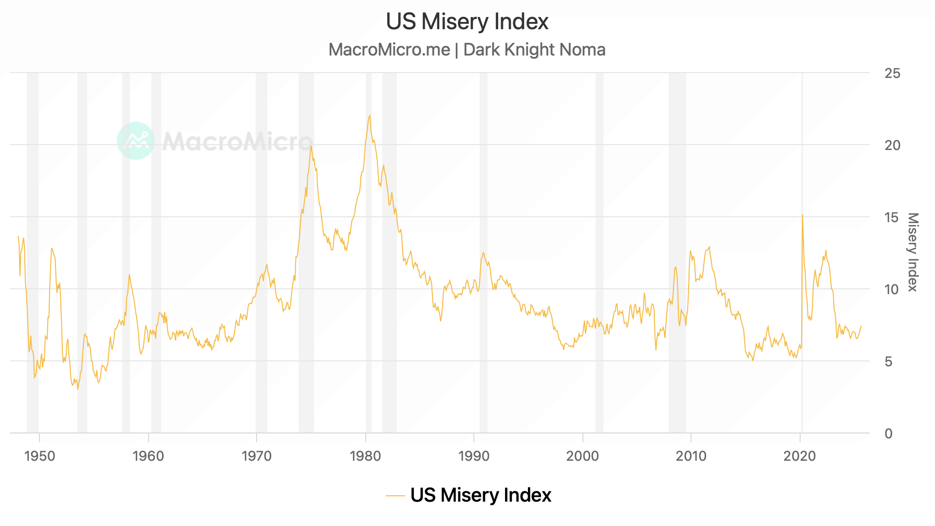 As we can observe, during the 70s era of stagflation, the high UR and inflation pushed the Misery Index to 20+.