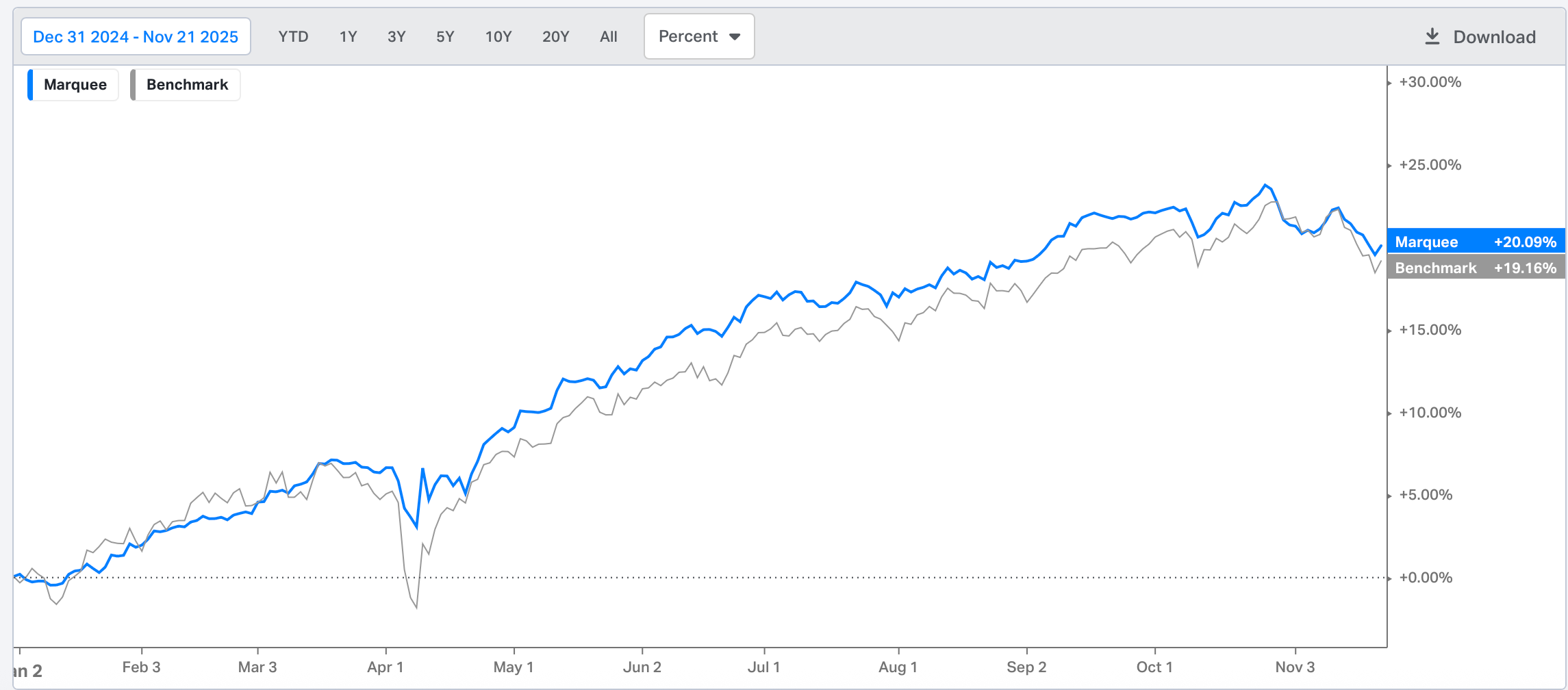 Despite elevated volatility and market turmoil, we are hovering around the 20% mark for our YTD performance as we raised cash on time.