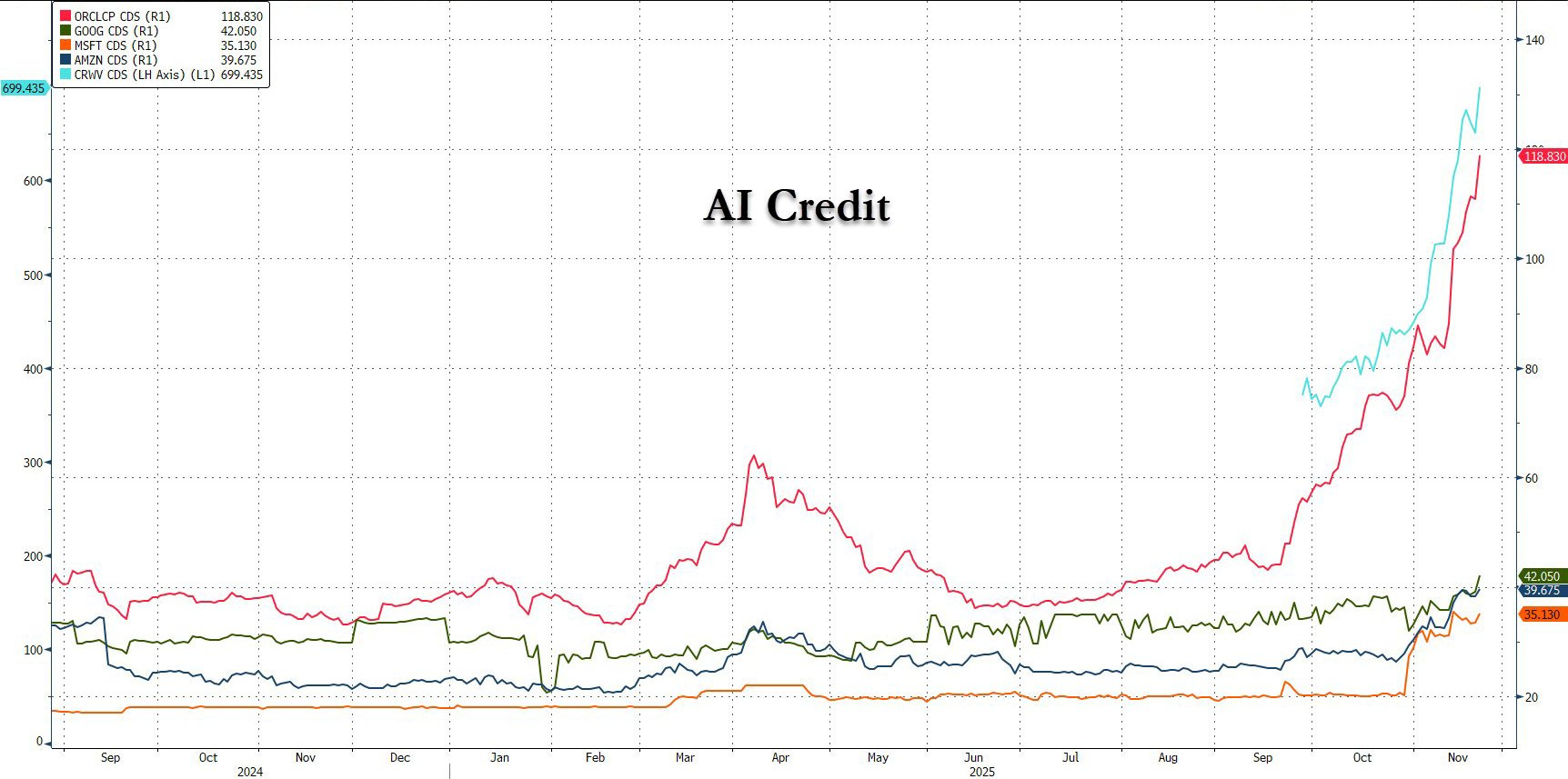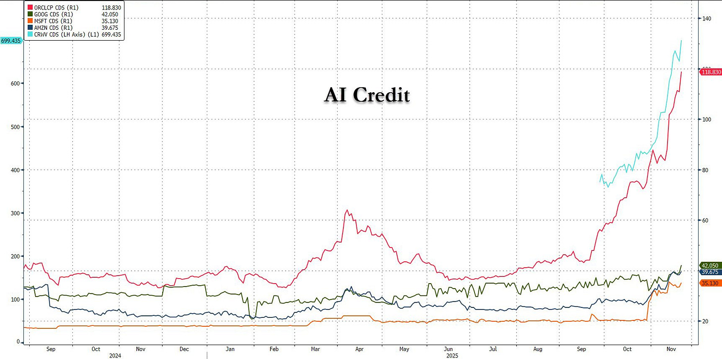 Nonetheless, credit markets continue to signal the demise of the AI trade, with CDS prices going parabolic, especially for the weaker names (CRWV, ORCL) in the circular AI ecosystem.