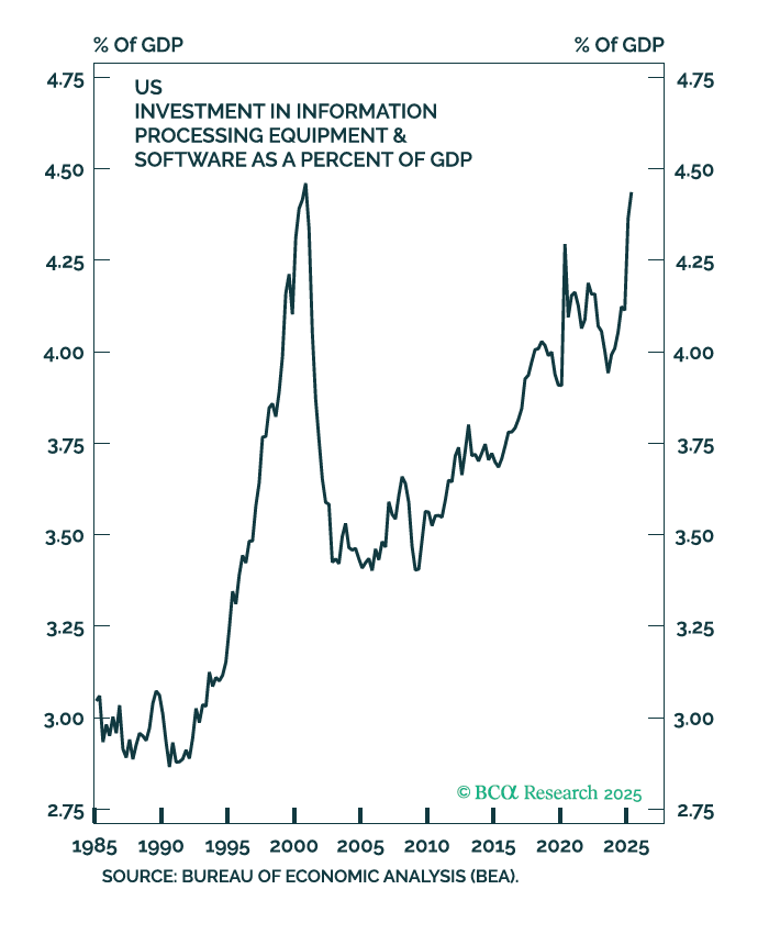 Before we discuss the macro data, we want to highlight intriguing charts from BCA Research on the AI rollout and capital expenditure (CAPEX).