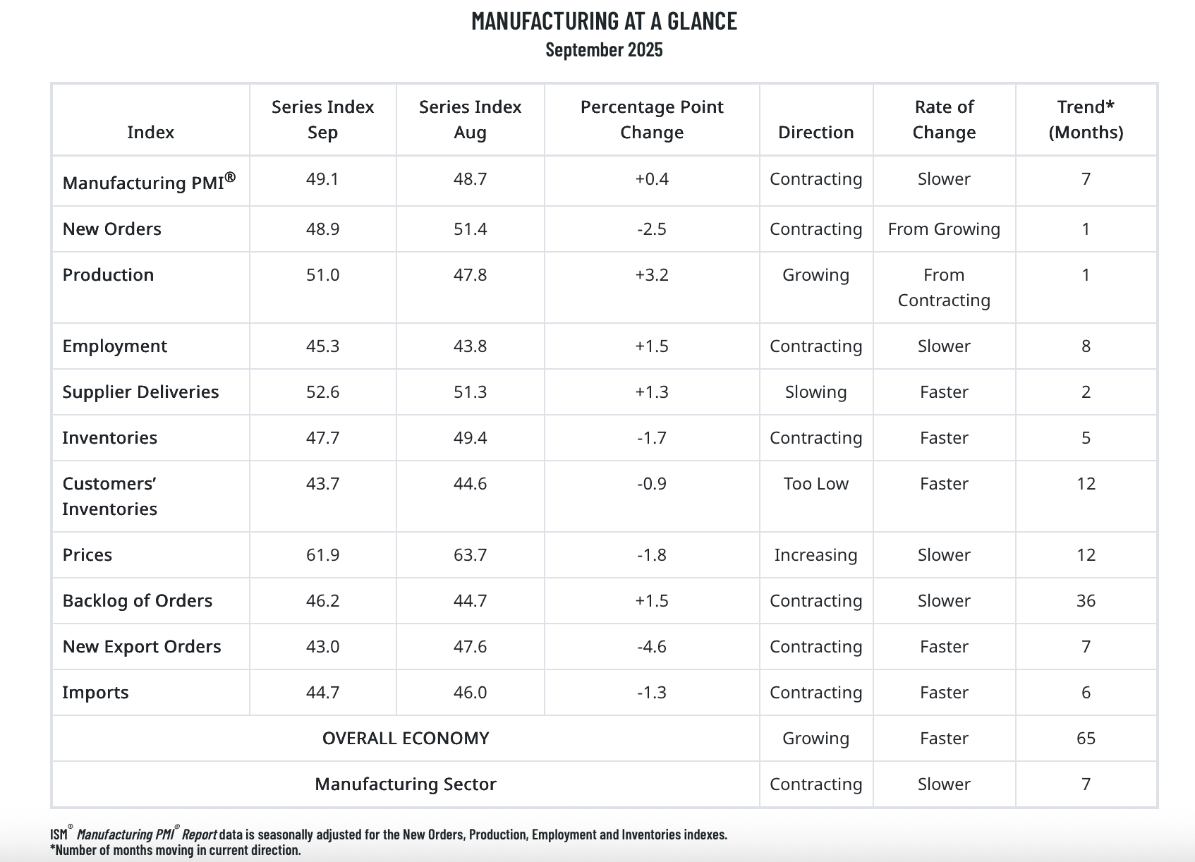 Although ISM Manufacturing PMI is below 50 (indicating contraction), it saw an improvement MoM, led by a rise in production and supplier deliveries.