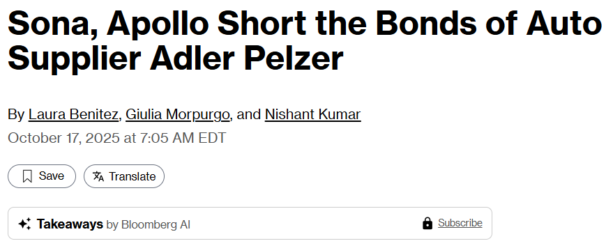 Now Apollo (along with Sona and Axebrook) is shorting Adler Pelzer, another auto-parts supplier.