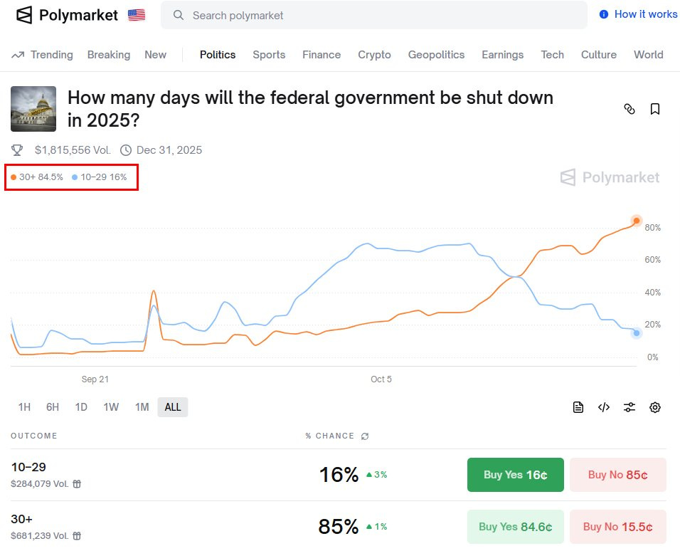 On the other hand, there is a complete stalemate in Washington. As per Polymarket, there is an 85% probability that the Federal Government shutdown is now expected to last more than 30 days.