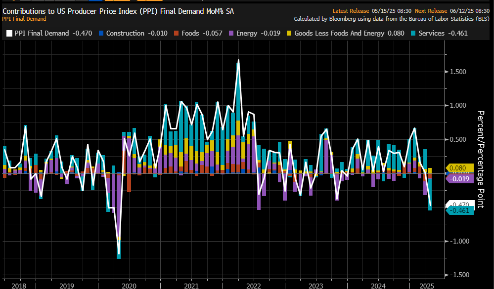 The PPI came in softer than expected, with the headline number at -0.5% MoM v/s expectations of 0.2%. Furthermore, the Core PPI came in at -0.4% MoM v/s expectations of 0.3%.