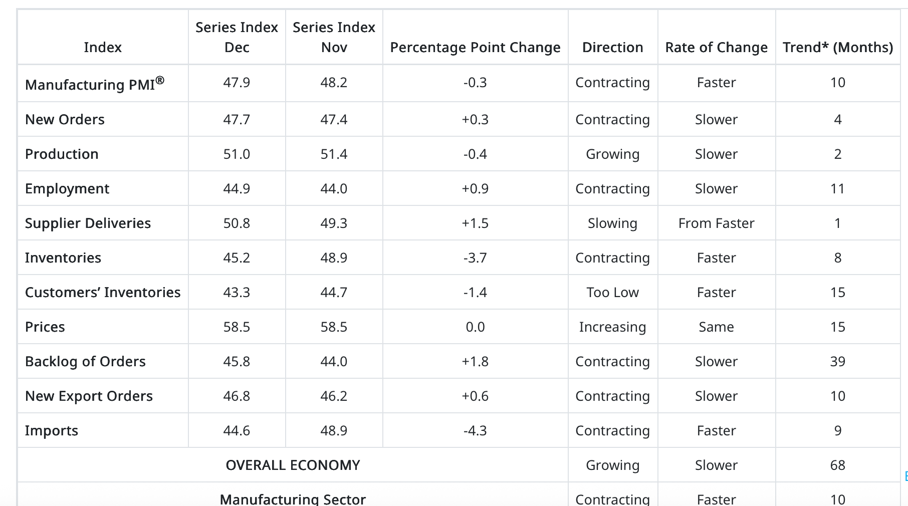 The ISM Manufacturing came in soft with the headline index reading at 47.9, marking the 10th consecutive month of contraction (below 50).