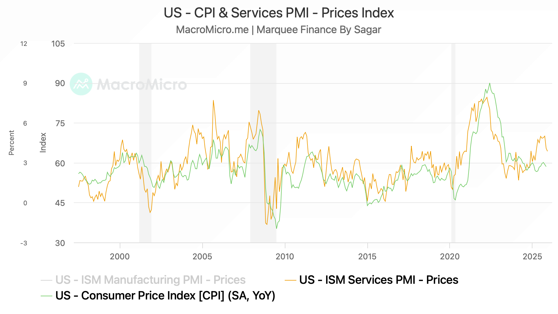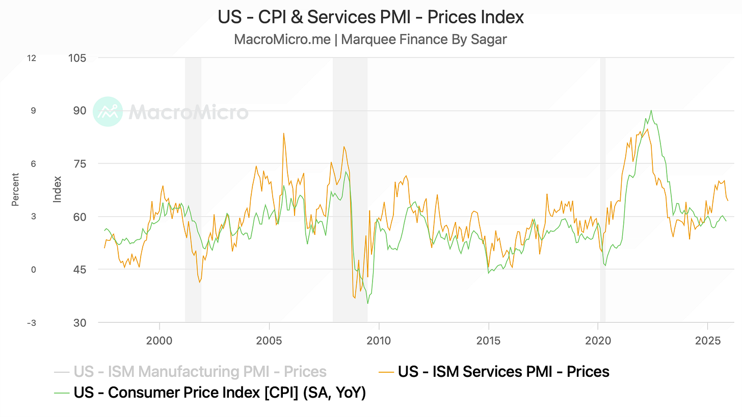 One of the data points we present monthly and track very closely is the ISM Services PMI Prices, as it has a tight correlation with the US CPI.